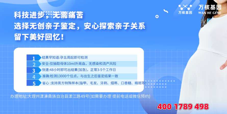 此外还有漾濞dna亲子鉴定,如:怀疑孩子非亲生,又不想其他人知道的。当然,这只是其中的一些例子,更多鉴定问题在线咨询漾濞亲子鉴定基因检测,办理地址:大理州漾濞彝族自治县漾江路49号(如需要办理 提前电话或微信预约)-预约电话:4001789498。